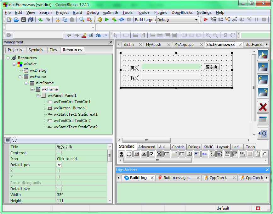 在生成如上界面的同时,产生两个文件:dictFrame.h和dictFrame.cpp。.wxs文件资源文件的目标也就是生成这两个文件,这是应用程序中的代码部分。