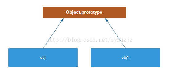 我们只要在系统中指明obj1和obj2等同于它们的原型,这样在读取的时候,只需要顺着指示去读原型即可。当需要写对象(例如obj2)的属性时,我们就复制一个原型的映像出来,并使以后的操作指向该映像即可。如图: