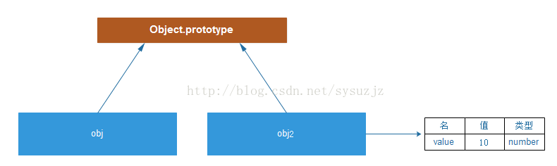 这种方法把复制的粒度从原型变成了成员。这种方法的特点是:仅当写某个实例的成员,将成员的信息复制到实例映像中。当写对象属性时,例如(obj2.value=10)时,会产生一个名为value的属性值,放在obj2对象的成员列表中。看图: