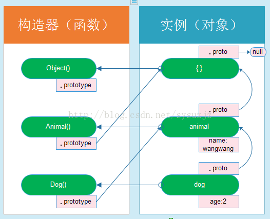 在这个例子中,我们如果在dog中查找name属性,它将在dog中的成员列表中寻找,当然,会找不到,因为现在dog的成员列表只有age这一项。接着它会顺着原型链,即.proto指向的实例继续寻找,即animal中,找到了name属性,并将之返回。假如寻找的是一个不存在的属性,在animal中寻找不到时,它会继续顺着.proto寻找,找到了空的对象,找不到之后继续顺着.proto寻找,而空的对象的.proto指向null,寻找退出。