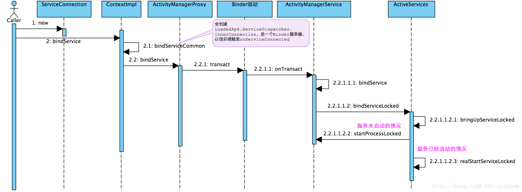 Client是调用Activity.bindService来绑定服务的,怎么会到ContextImpl.bindService中?上图中略去了一些步骤,这里结合代码说明: