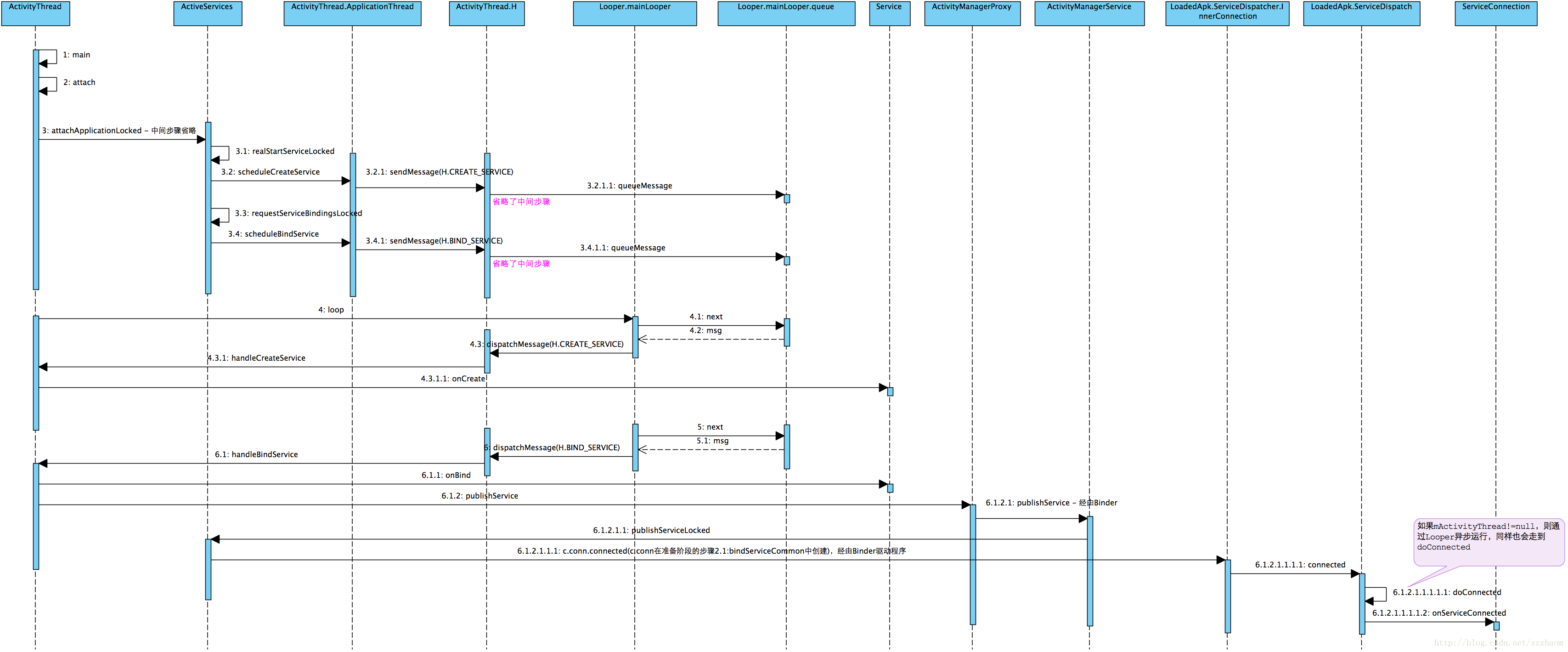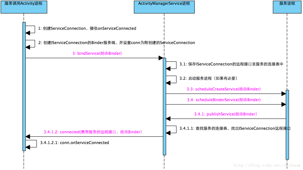 - 最后执行ServiceConnection.onServiceConnected,通知Activity,服务绑定完成。并得到了服务的远程接口。