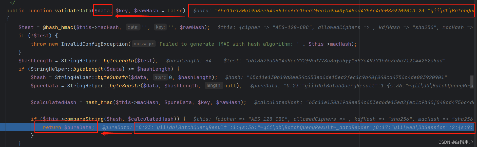 这里存在一个反序列化入口,就是下图else分支的内容,我们上一方法得到的反序列化数据会进入我们的反序列化入口(注意,allowed_classes 被设置为 false,则在反序列化过程中不会创建对象,只会还原基本数据类型,例如字符串、整数、数组等)。所以我们可以发现,在Yii2框架默认的环境下要进行这个反序列化操作,对php的版本是有所限制的,如下图,可以发现我们的版本中PHP_VERSION_ID 要小于70000才能到达我们期望的反序列化入口。我们可以从调用栈看到已经在进行我们的反序列化过程了。
