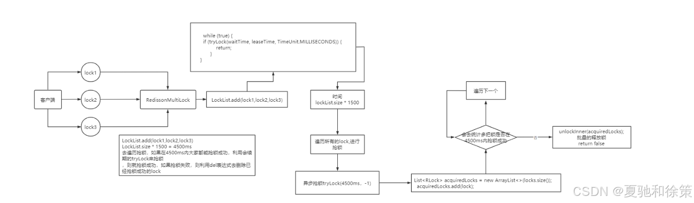 当我们去设置了多个锁时,redission会将多个锁添加到一个集合中,然后用while循环去不停去尝试拿锁,但是会有一个总共的加锁时间,这个时间是用需要加锁的个数 * 1500ms ,假设有3个锁,那么时间就是4500ms,假设在这4500ms内,所有的锁都加锁成功, 那么此时才算是加锁成功,如果在4500ms有线程加锁失败,则会再次去进行重试.