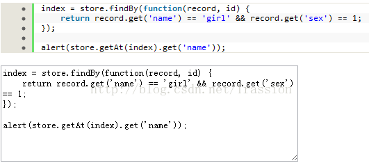 EXT还提供了函数find()和findBy(),可以利用它们对store中的数据进行搜索,如下面的代码所示。