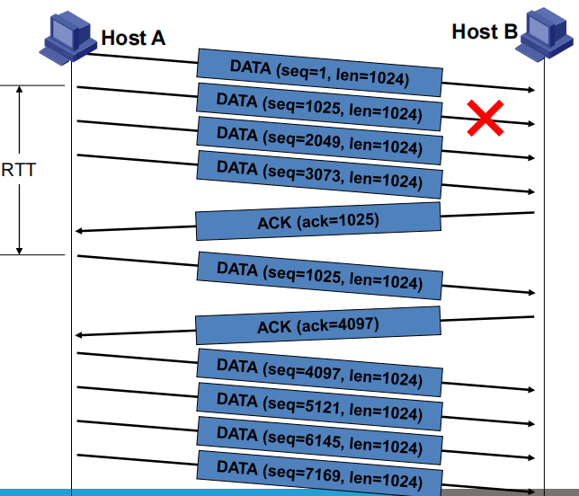 若某数据段(如 SEQ=1025 )丢失,Host A 发完启动定时器(RTT ),超时没收到 ACK 就重传该段,确保 B 收到完整数据。
