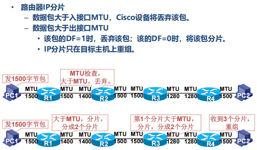 Cisco 路由器 / 交换机转发数据包时,进出接口都检查 MTU,规则分两种场景: