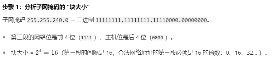先计算子网掩码的“块大小”,再逐一验证每个IP对应的那个段是否是块大小的倍数。