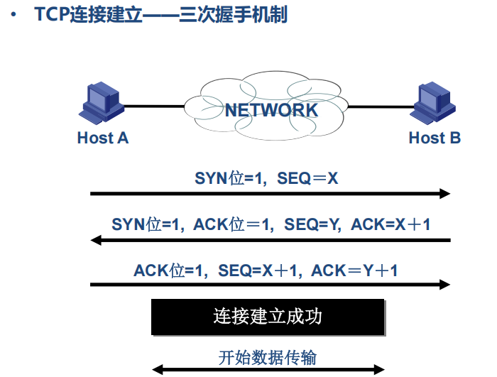Host B 回 SYN=1, ACK=1, SEQ=Y, ACK=X+1 → 同意连接,同时发自己的初始序号 Y ,并确认收到 A 的 X(期望下一个序号是 X+1 )。