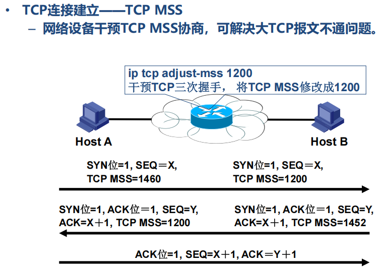三次握手时,双方交换 TCP MSS(如 Host A 说 “我能收 1460 字节的分段”,Host B 说 “我能收 1452 字节” ),避免发送的分段过大导致分片 / 丢包。