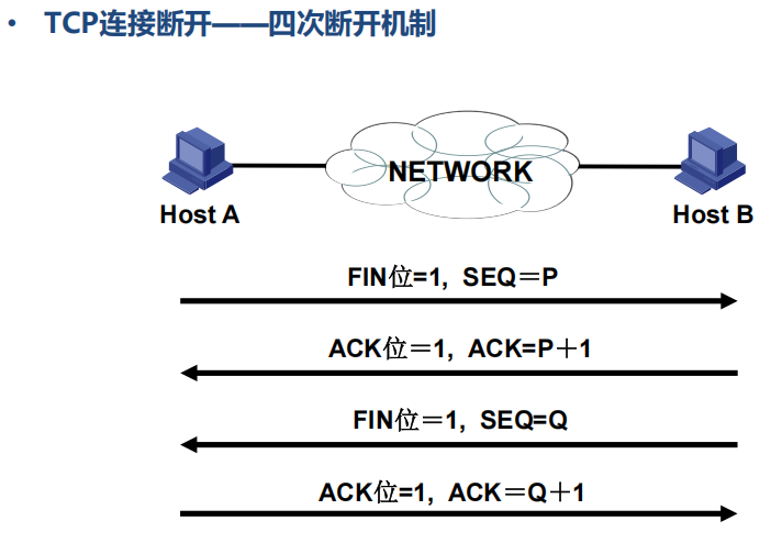 Host B 回 ACK=1, ACK=P+1 → 确认 A 的断开请求,但可能还有数据要发,先不关闭。