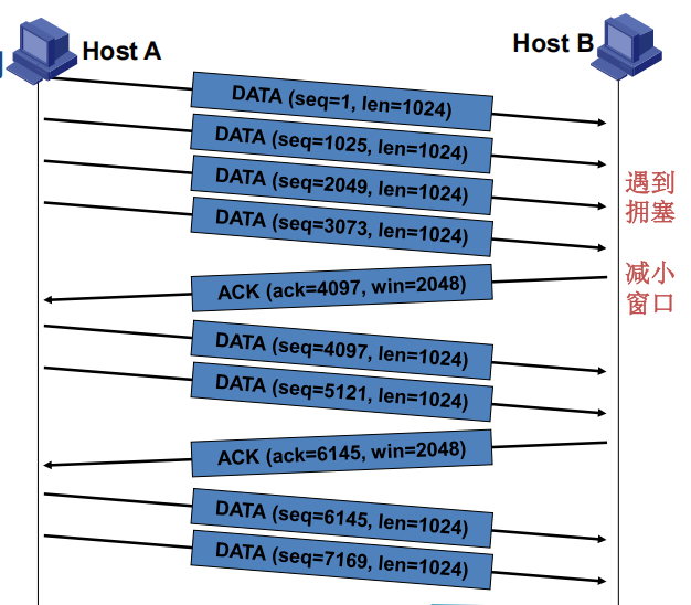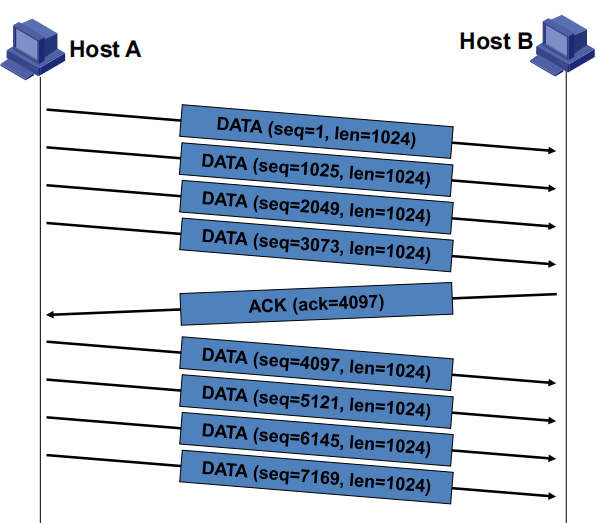 Host A 连续发多个数据段(带 SEQ 序号 ),Host B 回 ACK 确认(如 A 发 SEQ=1、1025、2049…,B 回 ACK=4097 ,表示 “收到到 4096 字节,下一个要 4097” ),保障数据有序、不丢。