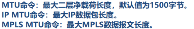 ① 只配 MTU 命令:影响所有类型报文(IP、MPLS 等)的转发,限制 “二层净载荷” 最大长度(默认 1500 字节 )。