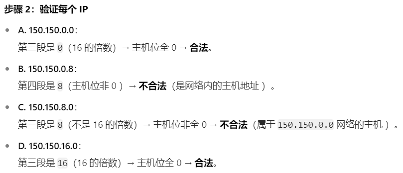 1. 子网掩码 255.255.240.0,判断 150.150.0.0、150.150.0.8、150.150.8.0、150.150.16.0 是否合法。