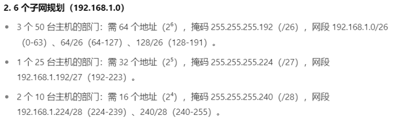 3. 就是要某单位要求有个部门,要建立6个子网,3个部门50台,1部门25台,2部门都是10台,有一个C类地址是192.168.1.0,求个子网的网络地址和广播地址及子网掩码。
