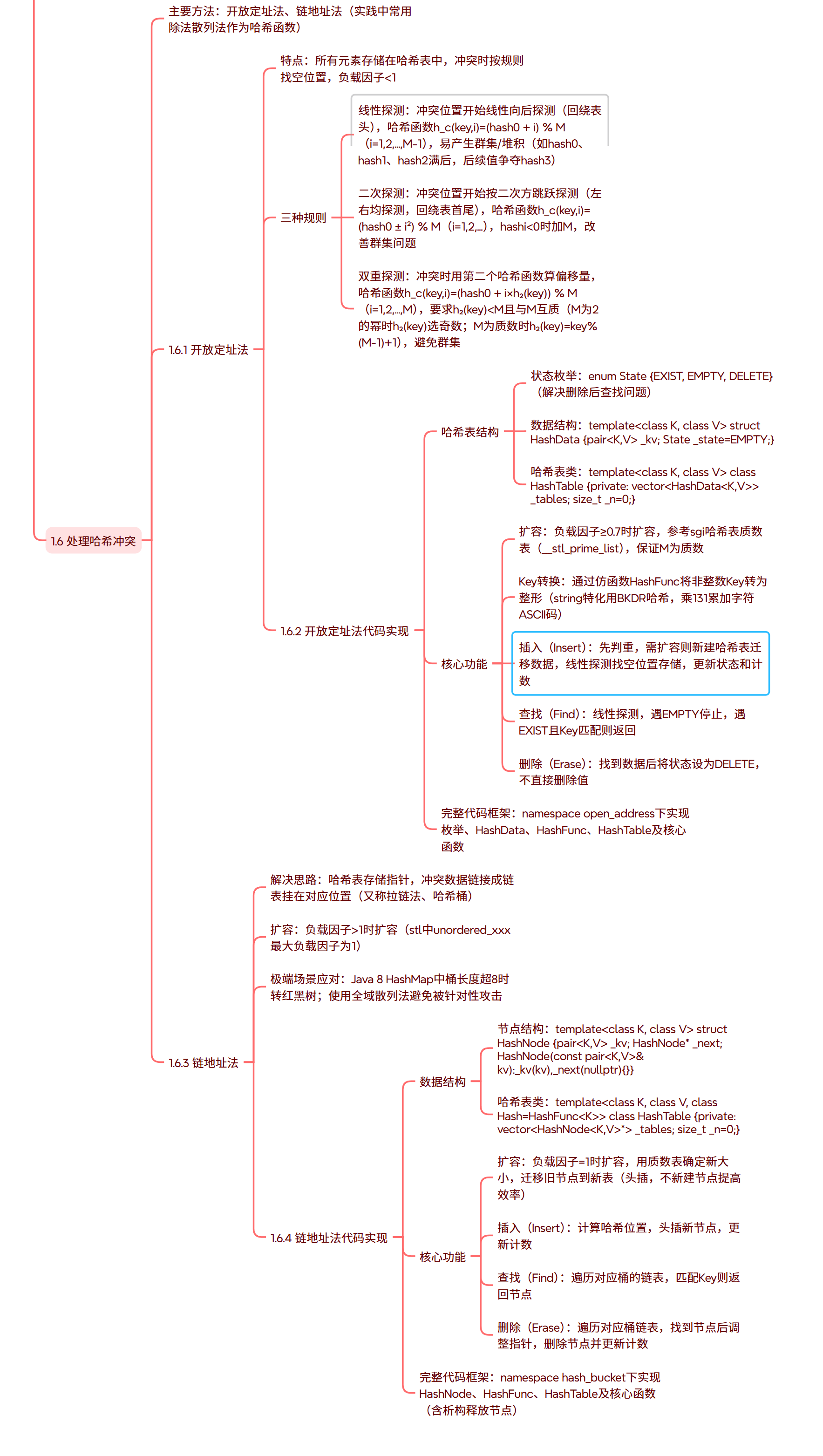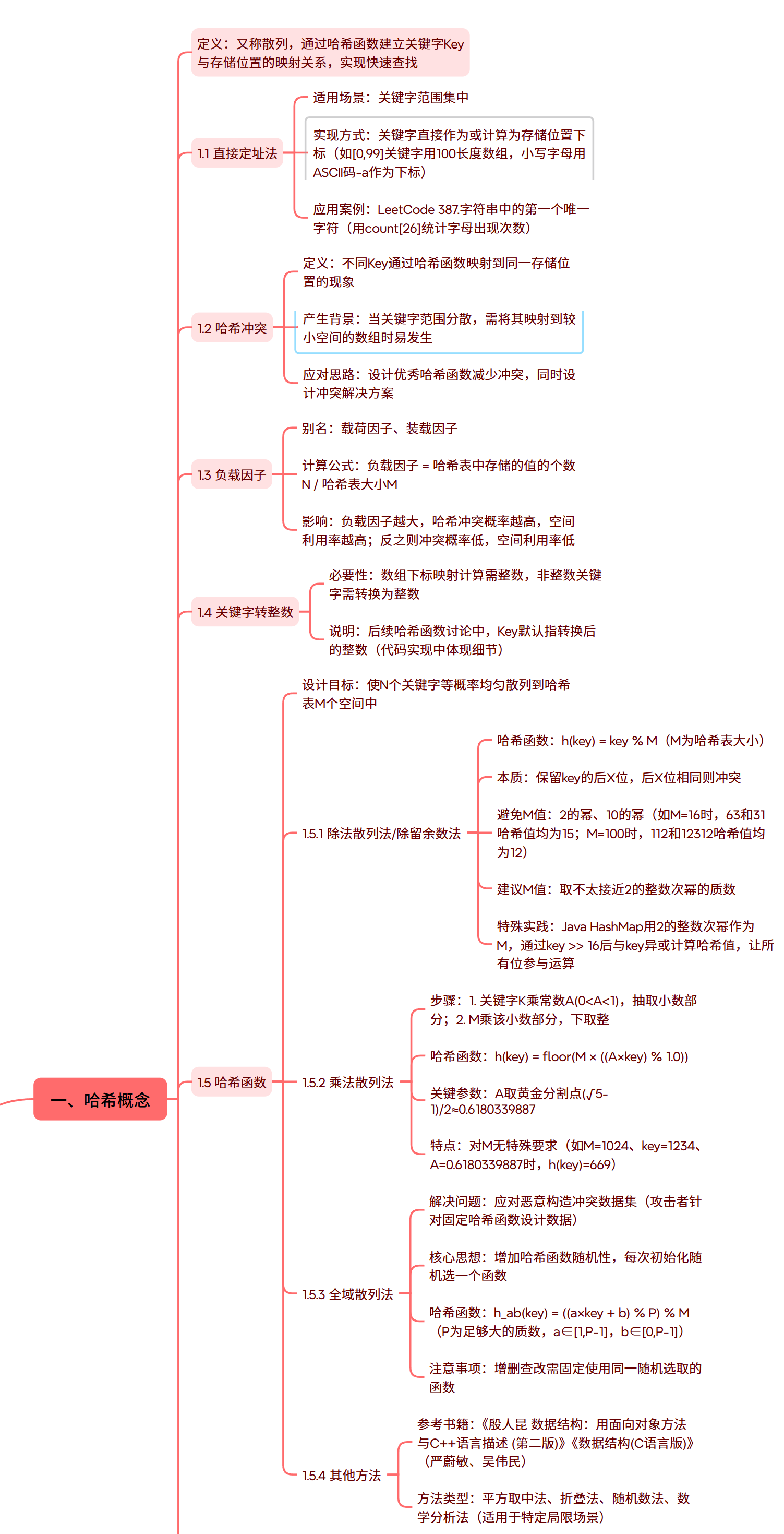 | 哈希函数 | 1. 直接定址法:键值直接作为索引(适用于数据集中场景,如 26 个字母统计)2. 除留余数法:Hash (Key) = Key % M(M 避免 2 的幂 / 10 的幂,减少冲突)3. 乘法散列法:h (key) = floor (M*((A*key)%1.0)),A 取黄金分割点(了解)4. 全域散列法:随机选取哈希函数减少冲突(了解)5. 其他:平方取中法、折叠法等(特定场景) |