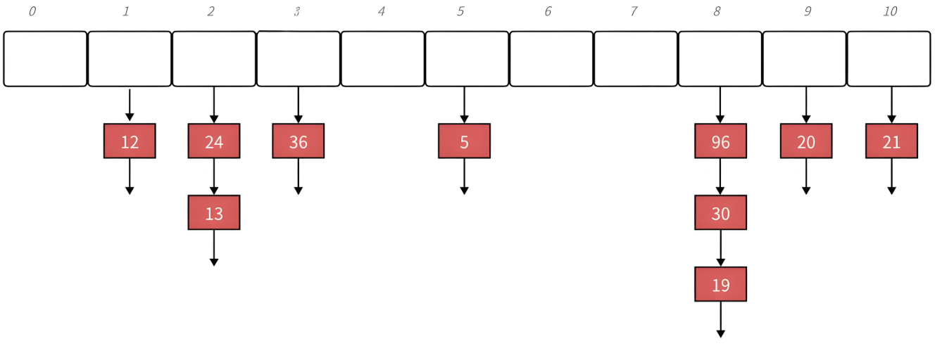 {19,30,5,36,13,20,21,12,24,96}映射到M = 11的表中: