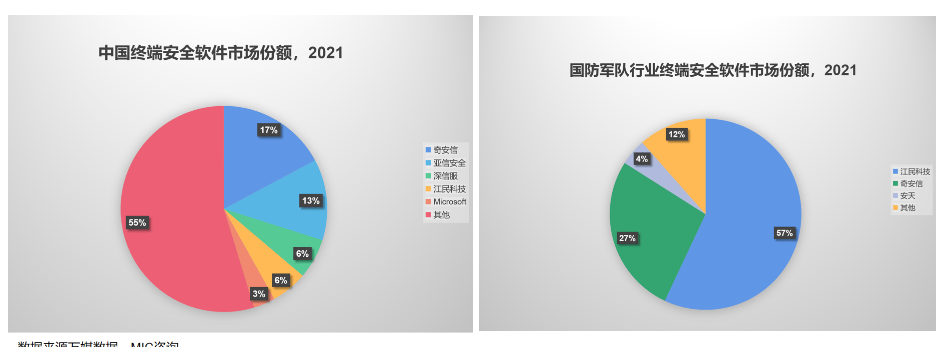 IDC报告数据显示,国内终端安全市场以 40%以上的增速,成为了 2021 年安全软件增长最快的子市场。多个机构报告中有提到,传统综合网安厂商份额涨幅较大。在细分市场,老牌安全厂商江民科技发力明显,江民防恶意代码产品在信创政企市场、国防军工、电力能源等行业的市场占有率分别为9.7%、57.6%、26.4%,持续占据行业领先地位,相较去年保持了50.3%的高速增长。