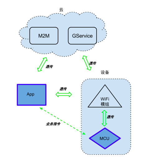 那机智云给他们带来哪些变化?我们可以先看看目前智能硬件的基本架构,也就是我们常说的黄金三角形,即云端、智能硬件、智能手机应用。云端的技术大多是互联网的 技术,与硬件工程师所熟悉的领域不太一样,我们需要有工具帮助开发者更好、更快地接入。出于这个考虑,机智云提供了一个叫 GAgent 的小固件程序,它运行在硬件平台里面,通常在 Wi-Fi 模块里,也可以在硬件的主控芯片里。GAgent 起到了一个承上启下的作用,对云端,它实现了所有的机智云接口,让硬件具有与云端连接的能力;对主控芯片,它又提供了一套对嵌入式开发很友好的封装,让硬件工程师可以面向业务编程,而不用去考虑云端通信的细节。