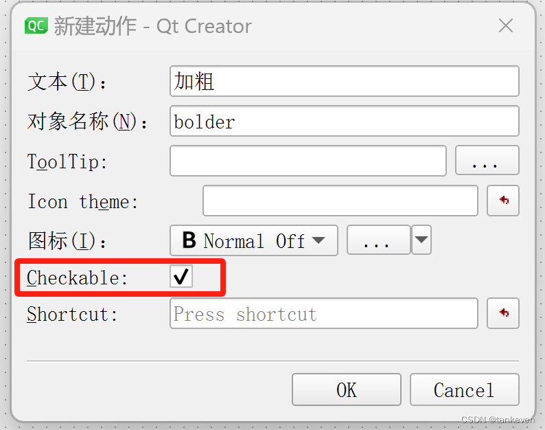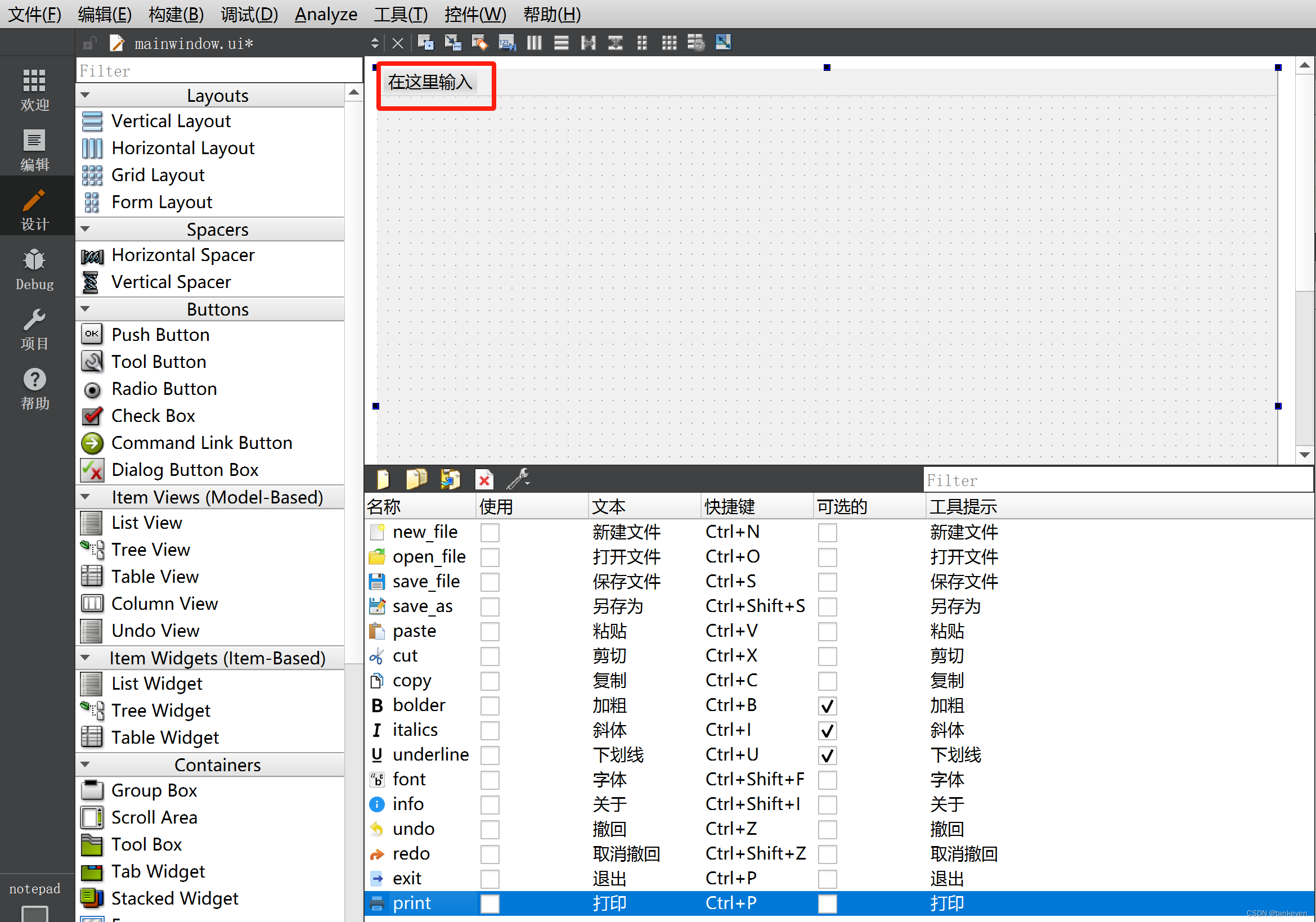 有些action需要勾选Checkable,可以选择的表示可以知道它们的区别是什么。