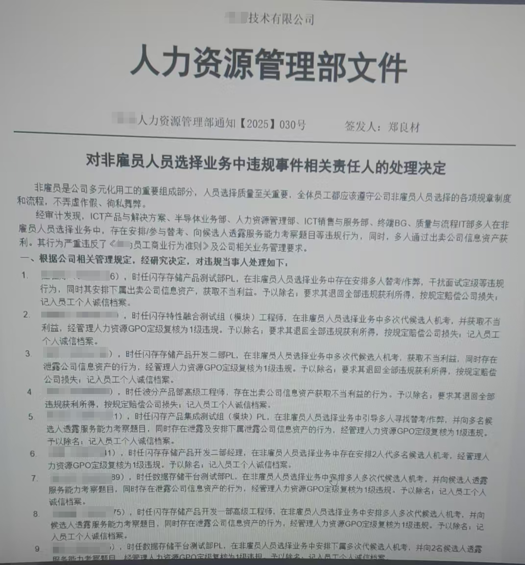 72名正式员工和19名非雇员因在OD招聘中参与替考、泄题、倒卖考题、收取回扣等行为被严惩,ICT、半导体、终端BG等核心业务部门集体沦陷。