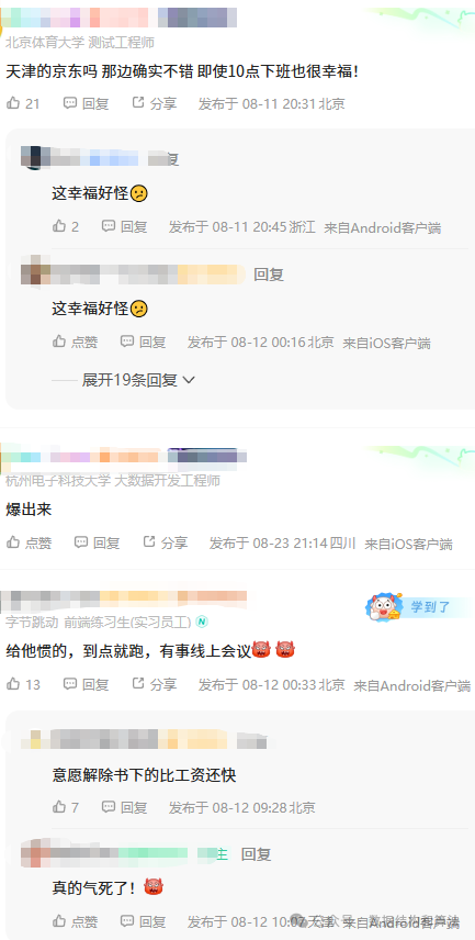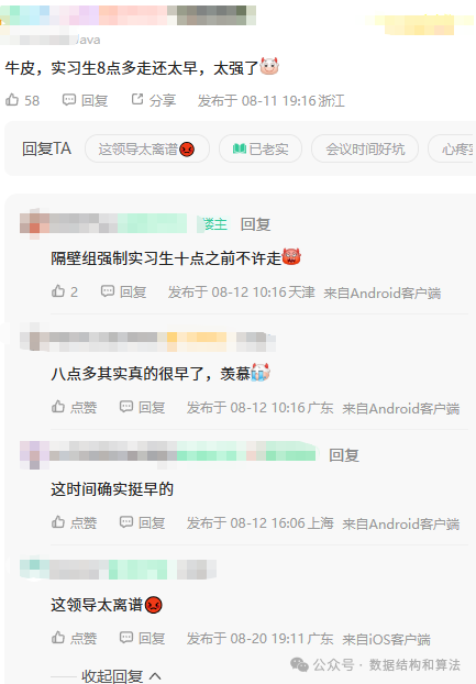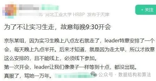 据网友爆料,京东某组为了不让实习生下班走,leader特意安排了一个会,每晚9:30开会。就是因为觉得大家下班太早了,所以才故意这么安排的,并且只能线下参加。