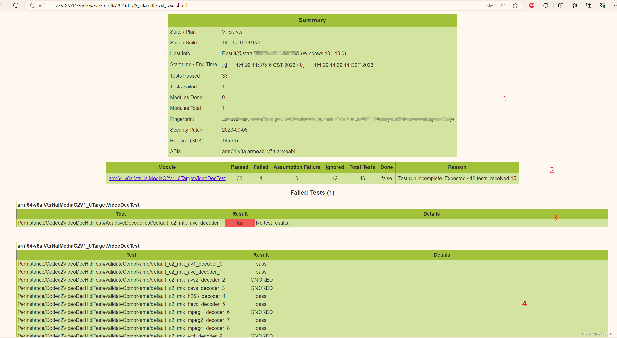 区域2,测试结果,记录一共跑了哪些模块,通过多少,失败多少,Assumption Failure多少,忽略多少,是否完成了整个测试。