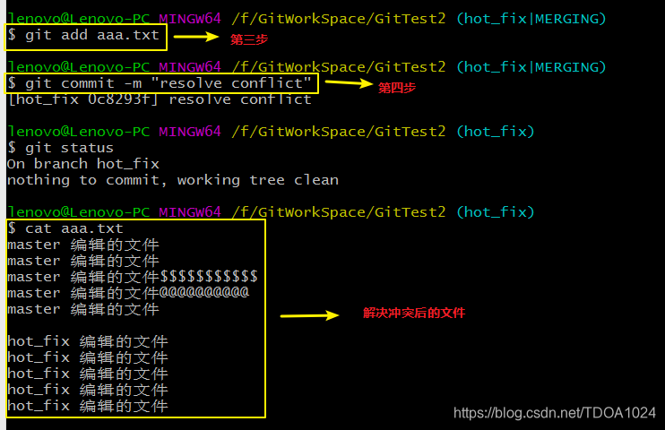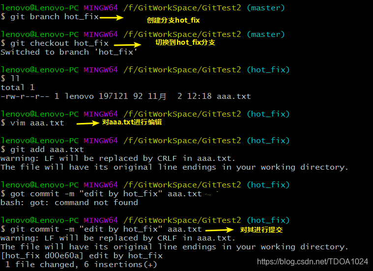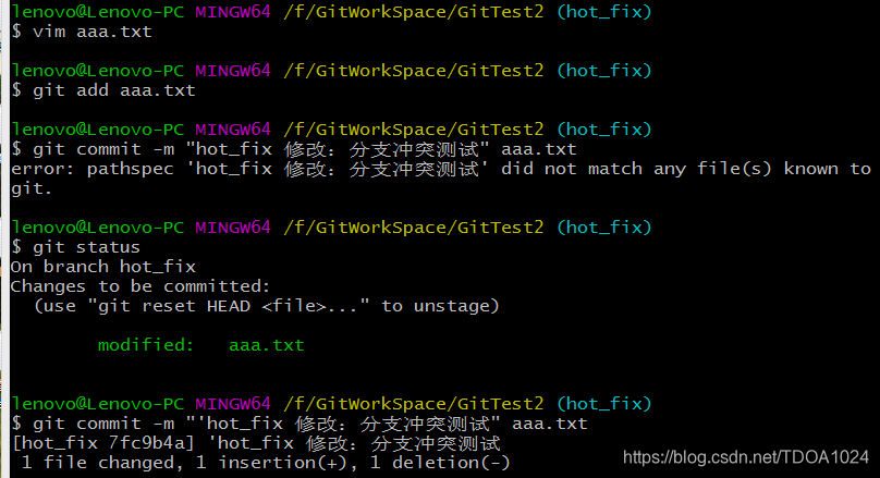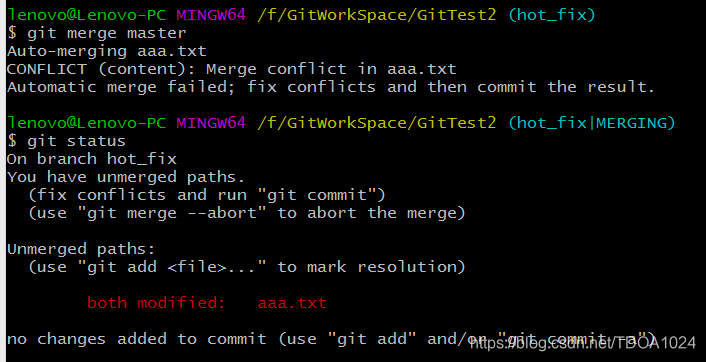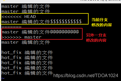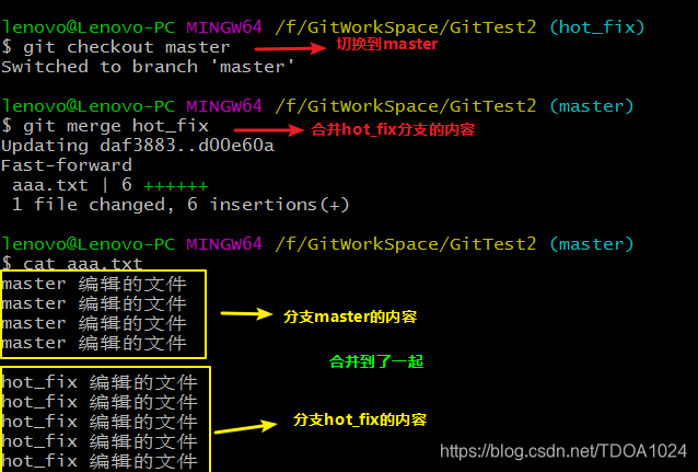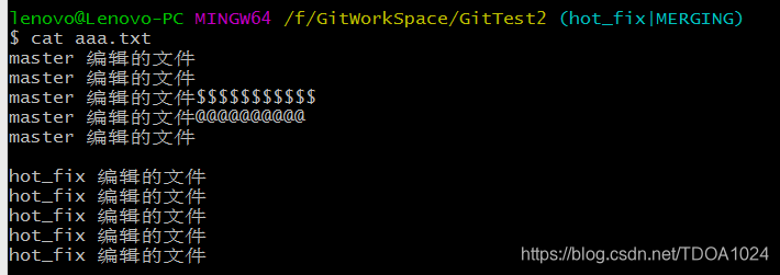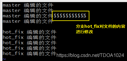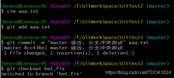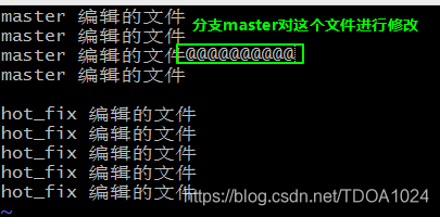 - 合并分支(使用hot_fix分支修改了文件的内容,然后切换到master分支进行合并)