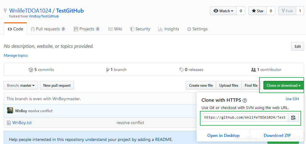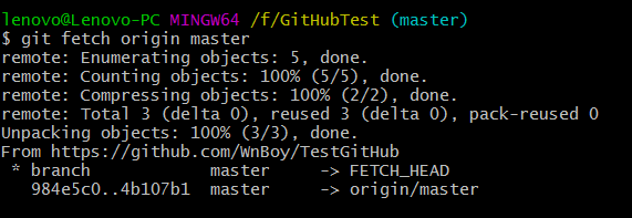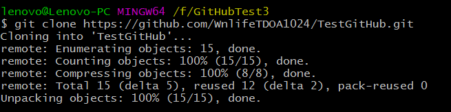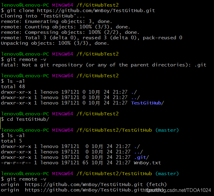 ② 执行 git clone [远程地址] 地址从WnBoy的GitHub上的TestGitHub项目上复制
