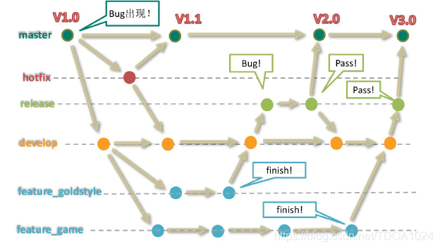 为了不影响较短周期的开发工作,一般把中长期开发模块,会从开发分支中独立出来。开发完成后会合并到开发分支。