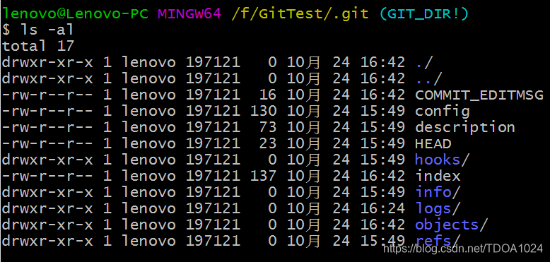 效果:在当前工作目录下创建了一个 .git 的文件夹,内容如下所示: