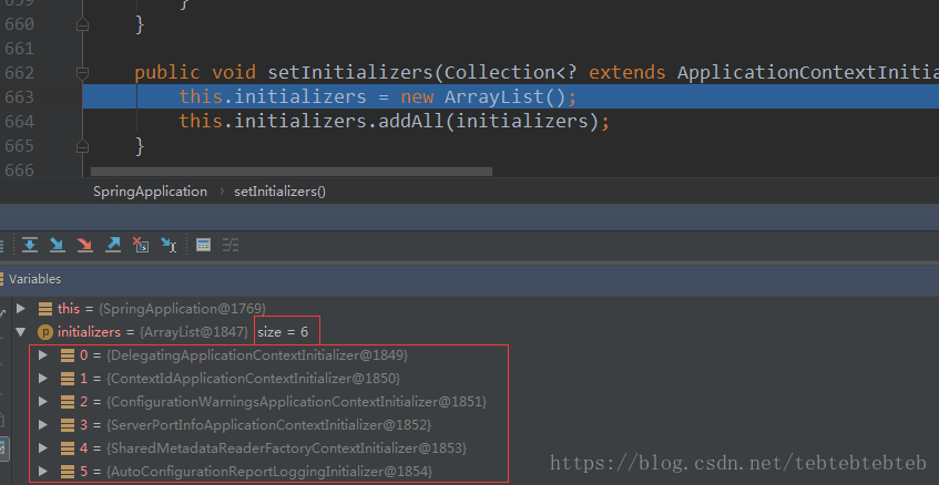 进入setInitializers()方法中,可以查看在当前项目中找到的ApplicationContextInitializer的个数