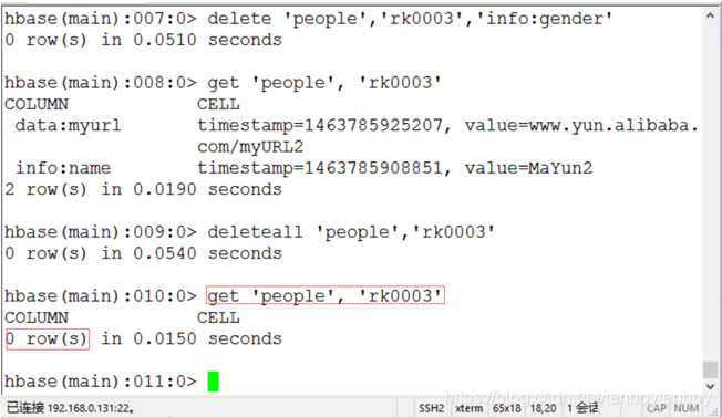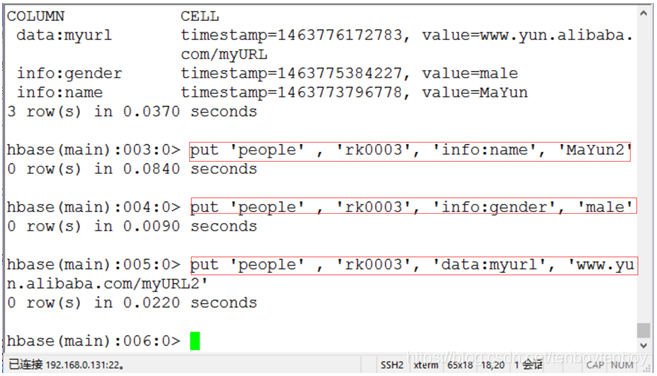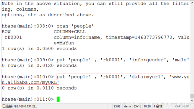 说明: 插入一行数据到列族data的列myurl中。在命令行中执行put 'people' , 'rk0001', 'data:myurl', 'www.yun.alibaba.com/myURL'。其中,rk0001为行健值,www.yun.alibaba.com/myURL为列族data中字段myurl的值。 |
