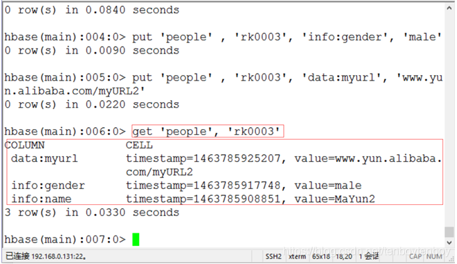 测试数据如下: put 'people' , 'rk0003', 'info:name', 'MaYun2' put 'people' , 'rk0003', 'info:gender', 'male' put 'people' , 'rk0003', 'data:myurl', 'www.yun.alibaba.com/myURL2' |