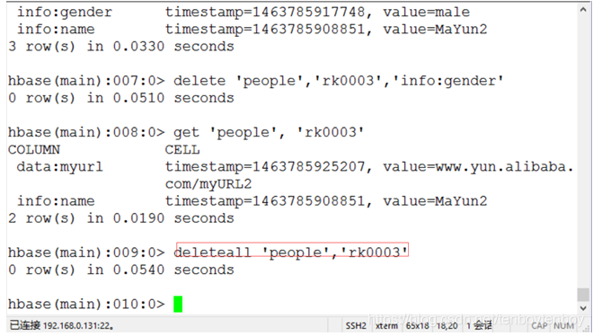 5.3 删除rowkey为rk0003的值的记录。执行命令deleteall 'people','rk0003'。如下图13所示。