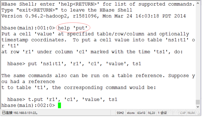 - 查看插入操作帮助。在命令行中执行执行help 'put',可以查看相关帮助文档。如下图4所示