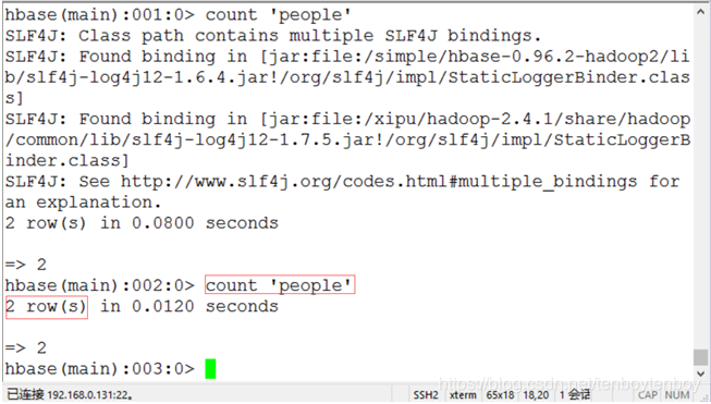 4.1 查询表people中的记录总数。执行语句count ‘people’返回记录数。如下图10所示。