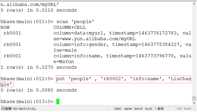说明: 插入一行数据到列族info的列name中。在命令行中执行put 'people' , 'rk0001', 'info:name', 'MaYun'。其中,rk0001为行健值,MaYun为列族info中字段name的值。 |