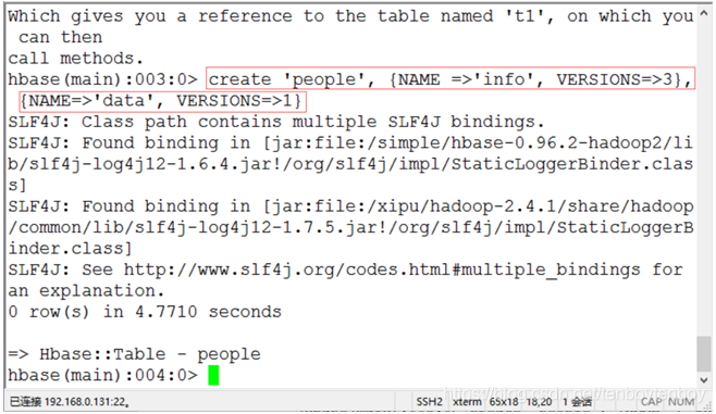 - 创在测试表。在命令行中输入create 'people', {NAME =>'info', VERSIONS=>3}, {NAME=>'data', VERSIONS=>1}创建people表。如下图3所示。