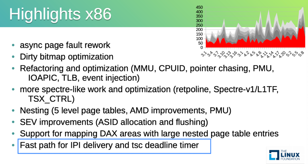 2020年,腾讯云一共贡献32个patch,其中两大技术方案被评为KVM年度核心突破:基于腾讯云提出的快速处理框架 ,IPI(处理器中断)和Timer(定时器)处理性能分别提升了30%和16.5%,底层业务响应速度大幅提升,性能损耗进一步降低。