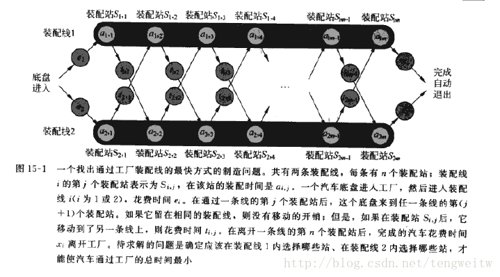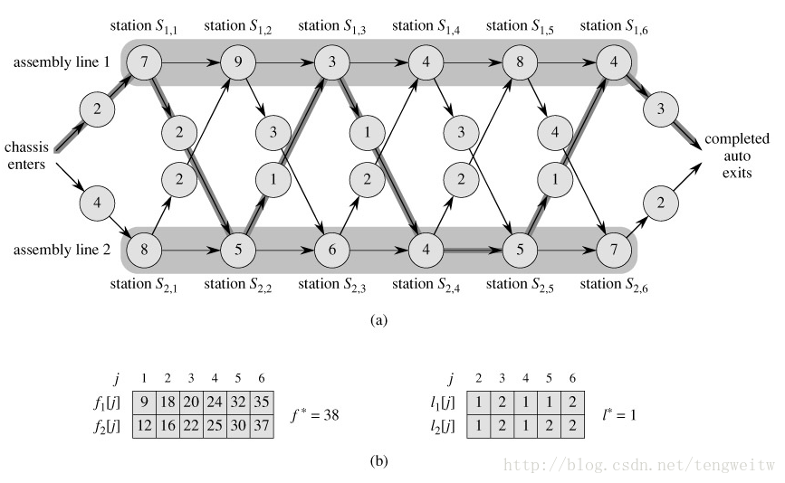 下面利用动态规划算法求解一些最优化问题,本文解决装配线调度问题,问题如下: