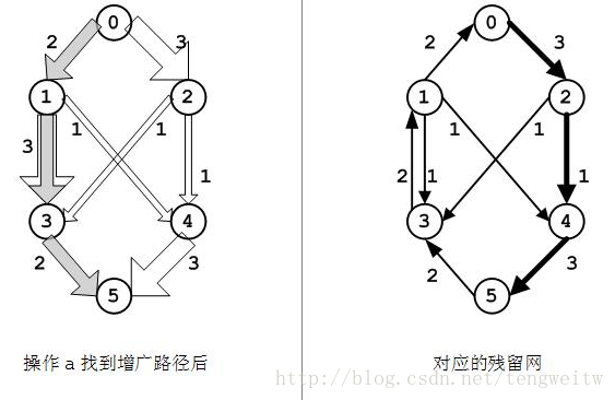 进一步在残留网中可以找到一条增广路径<v0, v2, v3, v1, v4, v5>,每条边的流为1,此原始流网络和残留网会有所变化,如下图。