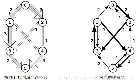(b)在操作(a)之后,路径<v0, v1, v3, v5>上有了大小为2的流,此时需要对残留图中相应的边做调整: