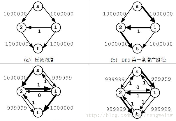 这里所选的路径寻找方法会直接影响算法的运行时间,例如,对图采用DFS的方法搜索残留网中的增广路径。图(b)中是第一次搜索得到的增广路径为<s, v1, v2, t>,路径的流大小为1;图(c)和(d)中搜索得到的增广路径的流大小也是1。可以发现,在这个例子中,采用DFS算法将需要2000000次搜索才能得到最大流。