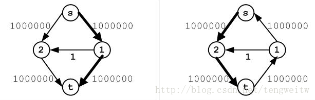 如果换一种方法对残留网中的进行遍历将会很快求得流网络的最大流。如图,第一次在顶点1搜索下一条边时,不是选择边(1, 2)而是选择容量更大的边(1, t);第二次在顶点2处搜索下一条边时,选择边(2, t)。这样只要两次遍历即可求解最大流。可见,在残留网中搜索增广路径的算法直接影响Ford-Fulkerson方法实现的效率。