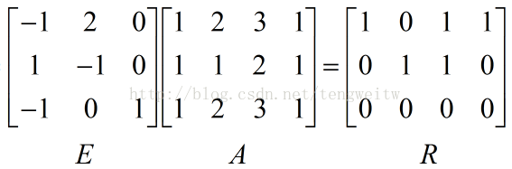 我们可以看出,初等矩阵E的第三行与A相乘得到的是0向量即: