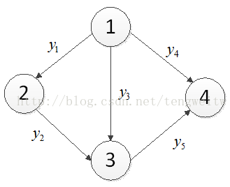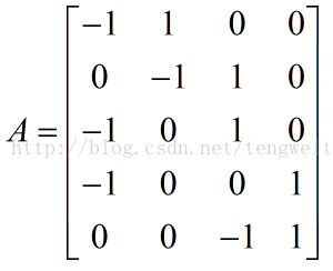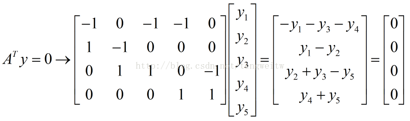 图中有1,2,3,4号节点,y1,y2,y3,y4,y5五条边,箭头的指向标明可以电流流向。我们假设电流的出发点设为-1,到达点设为1,则我们可以通过矩阵来表示上述网络: