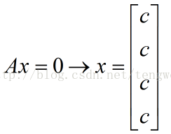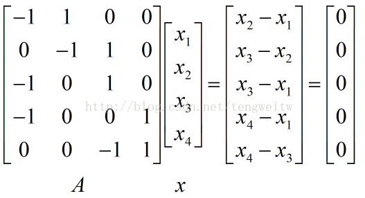 从上面的式子可以看出Ax的结果是各个节点之间的差值,假设Xi为第i点的电势,那我们就赋予了物理意义:Ax=0的意思是当节点电势取何值时,所有的节点之间的电势差为0。很显然,当所有节点等电势时显然成立,即:
