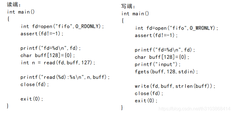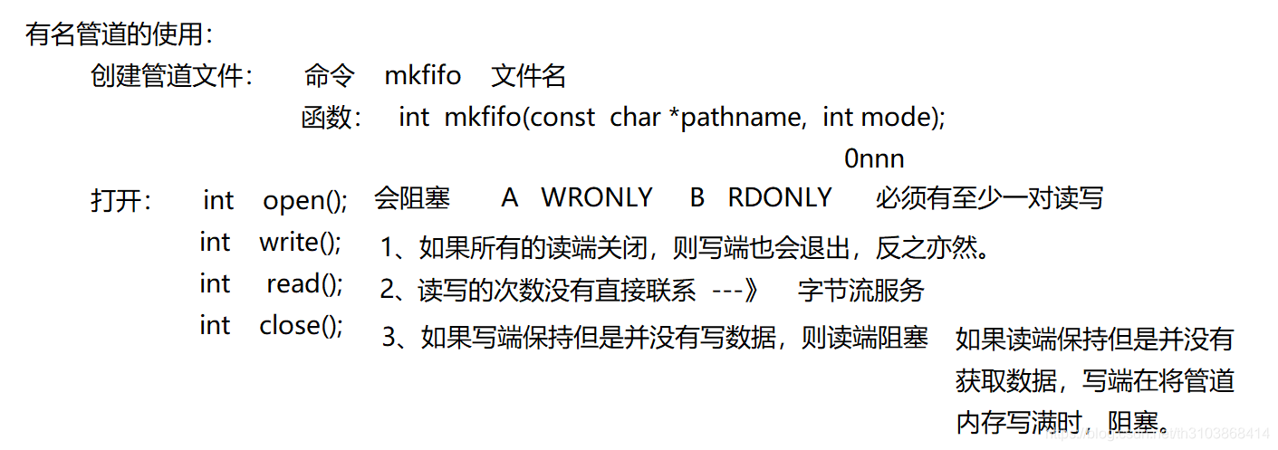 在磁盘上会存在一个管道文件标识,像普通文件一样,可以创建,但是管道文件不占用磁盘空间,数据会缓存在内存上。共享VFS。命令创建mkfifo,代码创建mkfifo(),open :A进程写数据,B进程不读就没有意义。如果A进程结束,B进程也结束。管道写端关闭,读端返回值为0。 读写必须同时存在,可以两个读一个写,两个写一个读,只有读或者只有写,open是不会返回的。读或者写关闭,另一端就会出错返回。读和写的次数没有直接关系。open成功以后,写端不写,读端阻塞。读端不读,写端缓冲区满,写端阻塞。