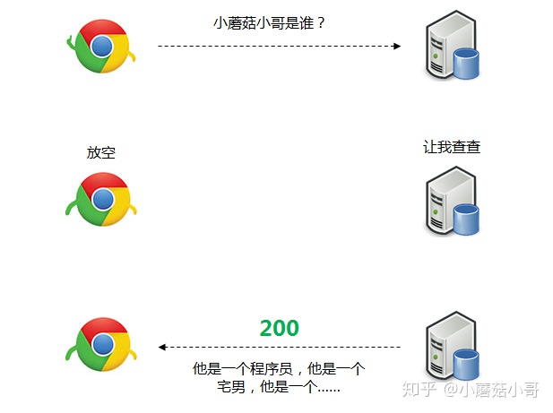 流程上说,浏览器先请求缓存数据库,返回一个缓存标识。之后浏览器拿这个标识和服务器通讯。如果缓存未失效,则返回 HTTP 状态码 304 表示继续使用,于是客户端继续使用缓存;如果失效,则返回新的数据和缓存规则,浏览器响应数据后,再把规则写入到缓存数据库。